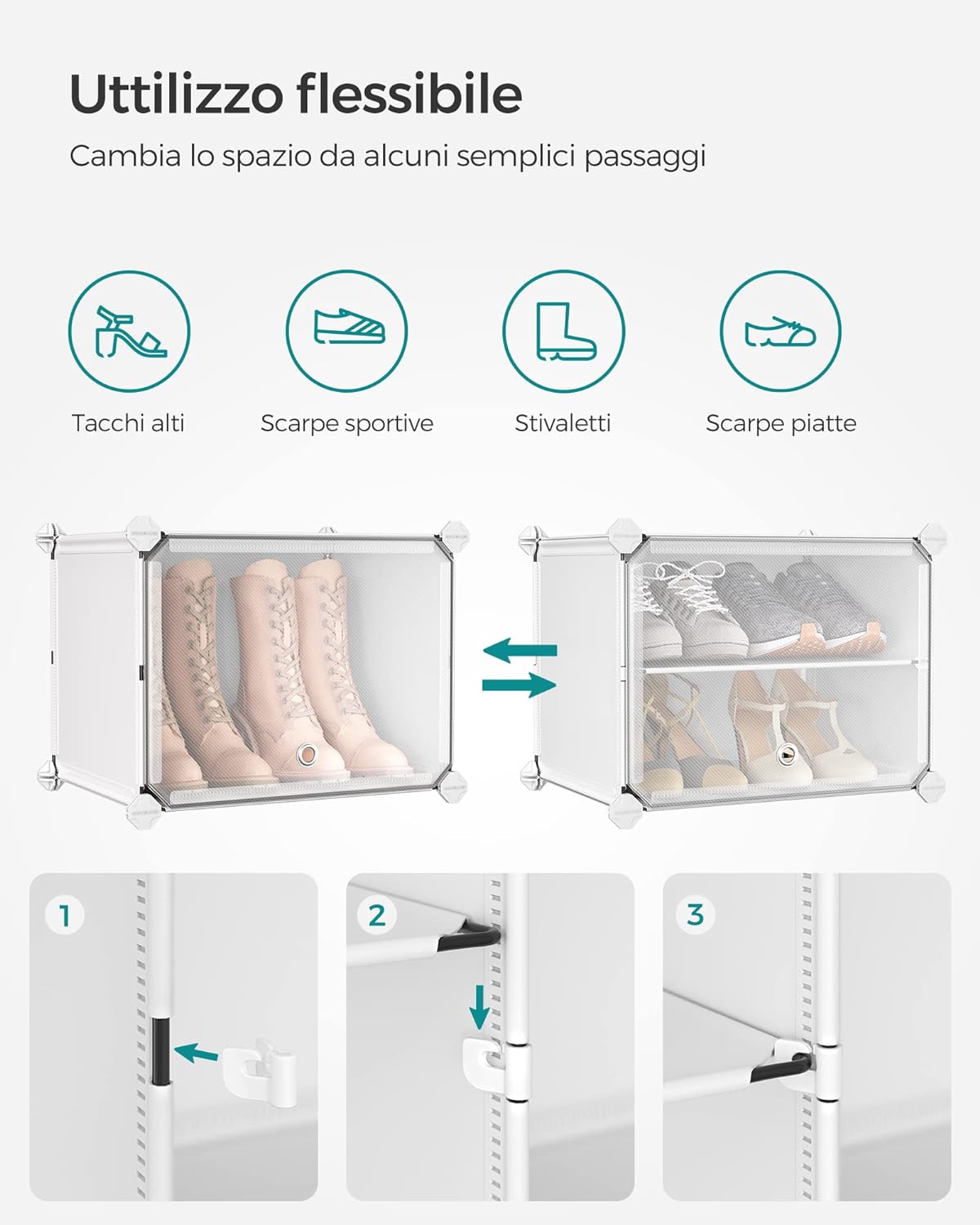 - [Facile da pulire e antiodore] La scarpiera con sportelli trasparenti è antipolvere, impermeabile e facile da pulire. Protegge le scarpe da polvere e macchie d'acqua durante l'esposizione, l’occhiello che funge da maniglia evita anche l'accumulo di odori